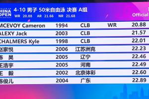 直播吧03月20日讯 中国游泳公开赛男子50米自由泳A组决赛,31岁的澳大利亚选手卡梅伦·麦克沃伊游出20秒88,打破世界纪录夺金。杰克·阿莱克西21秒57夺得银牌,凯尔·查尔默斯22秒01夺得铜牌。