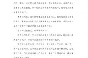 队员阿卜杜瓦哈普·艾尼瓦尔、艾力库提·艾沙江、努尔艾力·吐尔逊阿力,在冲突发生瞬间未能保持应有的冷静克制,出现不当行为,俱乐部对其提出严肃批评,要求三人即刻反省,提交深刻的书面检讨报告。