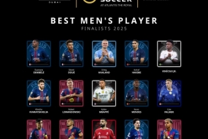 直播吧12月3日讯 环球足球奖公布了2025年最佳男足球员15人候选名单,哈兰德、姆巴佩、萨拉赫、亚马尔在列。
