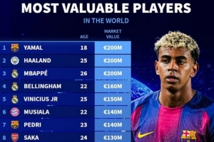 直播吧12月13日讯 德转列当前身价排名前十五的球员,亚马尔、哈兰德、姆巴佩2亿欧并列第一。