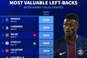 直播吧4月7日讯 德国转会市场公布了最新的足坛左后卫身价排行榜,其中巴黎圣日耳曼左后卫门德斯以7500万欧元,排名第一。